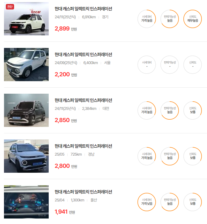 캐스퍼 일렉트릭 중고차 가격 시세표 | 25년 6월 기준