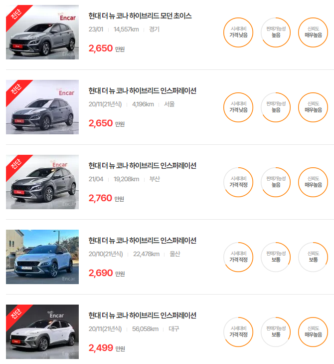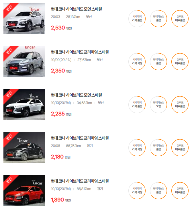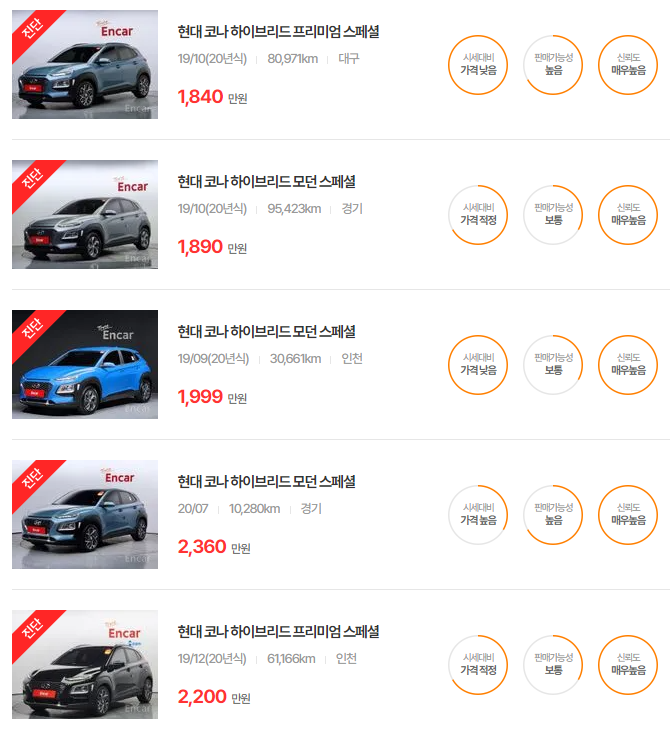 코나 하이브리드 중고차 가격 시세표