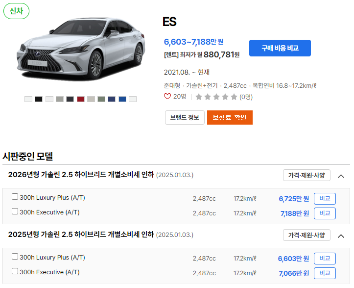 2025년형 렉서스 ES 하이브리드의 가격은 6,690만 원부터 7,160만 원 사이입니다.