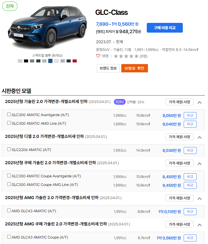 2025 벤츠 GLC 쿠페의 가격대는 다양하며, 트림에 따라 상이합니다: