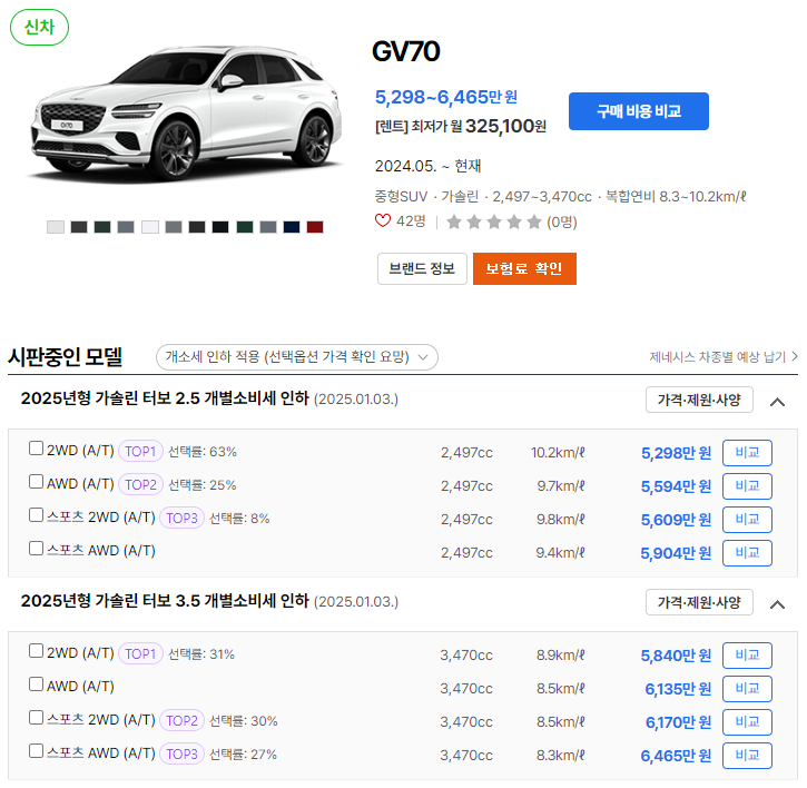 2025 제네시스 GV70의 가격은 모델에 따라 상이합니다.