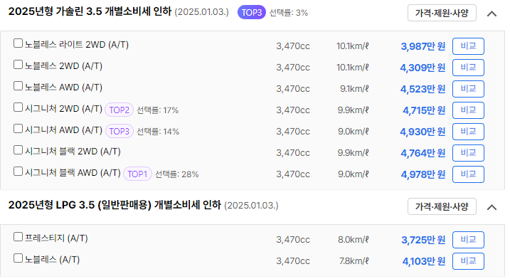 • 노블레스 라이트: 2,497cc, 12.0㎞/ℓ, 3,736만 원